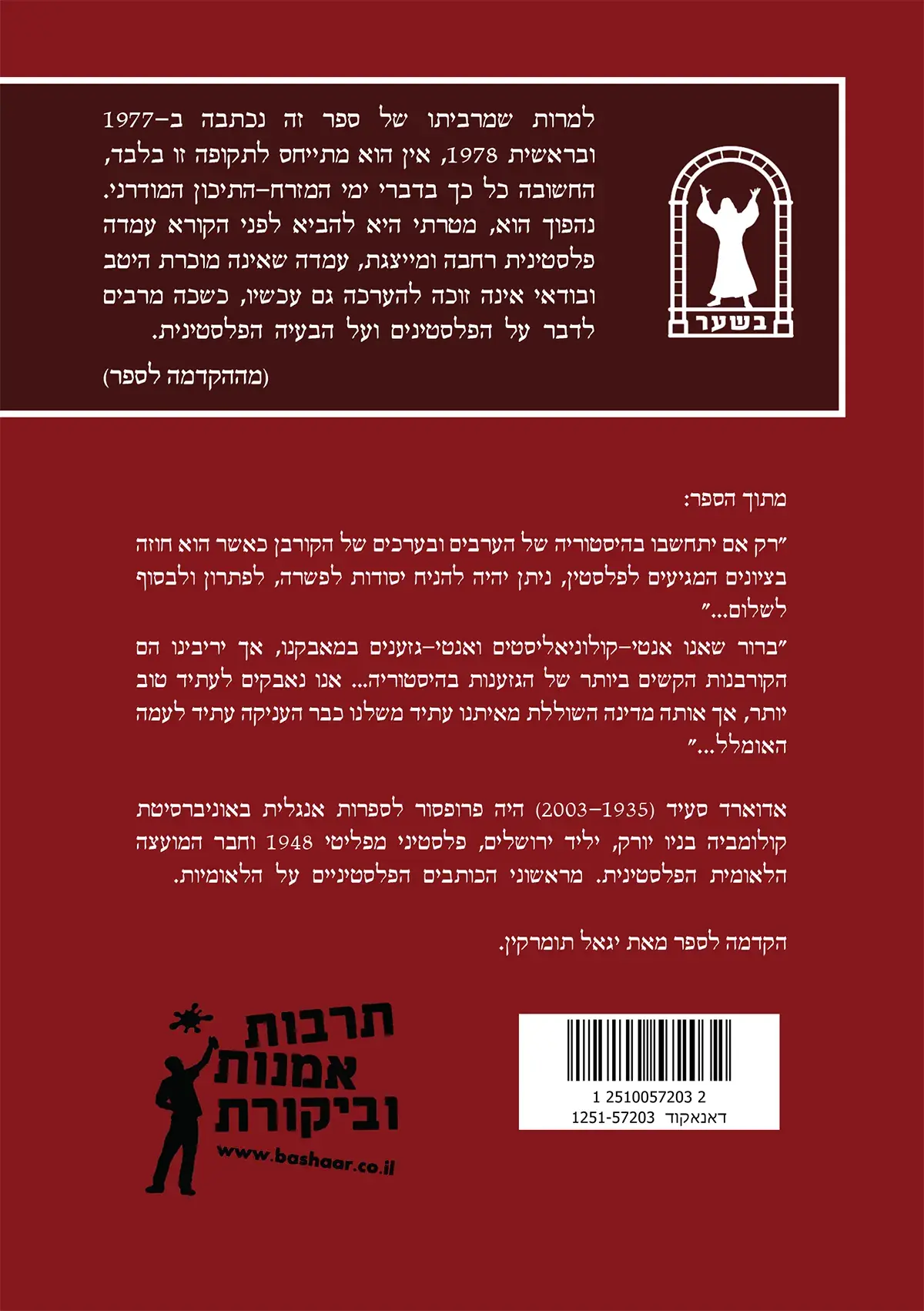 בחיבורו המונומנטלי 'שאלת פלסטין', אדוארד סעיד נדרש למשימה המורכבת של הגדרת הלאומיות הפלסטינית תוך התמודדות כנה עם הזהות הישראלית והציונית. סעיד מנתח את האופן שבו שני הצדדים מנהלים מאבק שנתפס לעיתים קרובות כמשחק סכום אפס, שבו כל הישג של האחד נחשב להפסד של האחר. הוא מציע גישה אחרת המכירה בהישגיה הפוליטיים והתרבותיים של ישראל ובעובדה שהעם היהודי הגיע לארץ כקורבן של גזענות והשמדה, ובכך הוא מייצר שיח רב-ממדי ונועז.